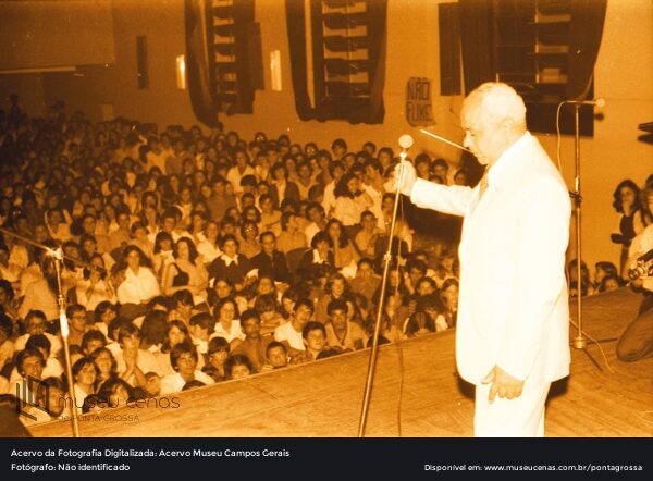 Espectadores do primeiro Festival Universitário da Canção (FUC) acompanhando a apresentação de artistas não identificados no palco. A primeira edição do evento, que teve como local escolhido o Auditório da Reitoria da UEPG, contou com a presença de um grande público: na abertura, mais de 1.000 pessoas compareceram no Auditório, excedendo o limite de 400 pessoas do local.