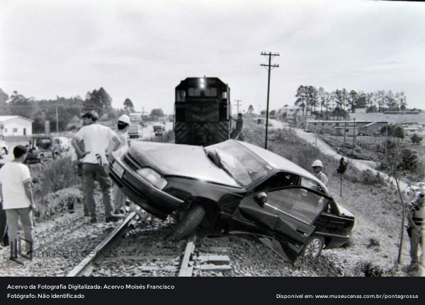 Fotografia de um acidente entre um trem e um carro. Local não identificado.