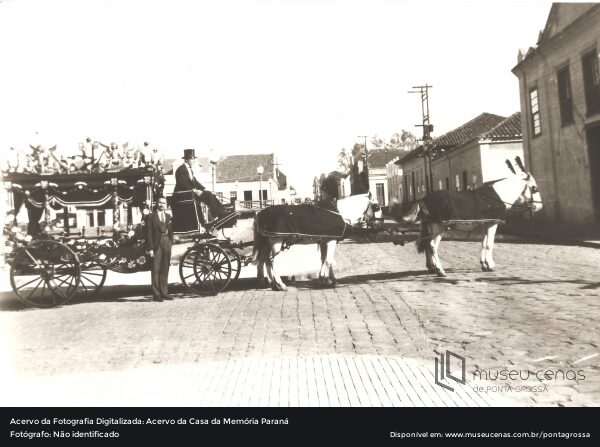 Carro fúnebre puxado por cavalos da Empresa Bortolo Ranni na Rua Sant’ana, ao fundo está a antiga Igreja do Rosário.
