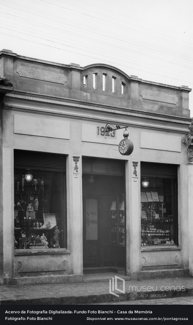 Fotografia da fachada da Casa Romano, fundada em 1906 e de propriedade de Antônio Romano. Estava localizado na Rua XV de Novembro, na centro da cidade. Na imagem, é possível observar, além de relógios na vitrine, algumas joias e objetos de decoração.