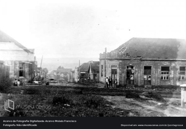 Fotografia dos estragos causados pelo ciclone na década de 1920, na cidade de Ponta Grossa. Nesse período, houveram várias campanhas para auxiliar as pessoas que tiveram suas casas destalhadas devido ao mau tempo. Data da foto: 24/10/1927