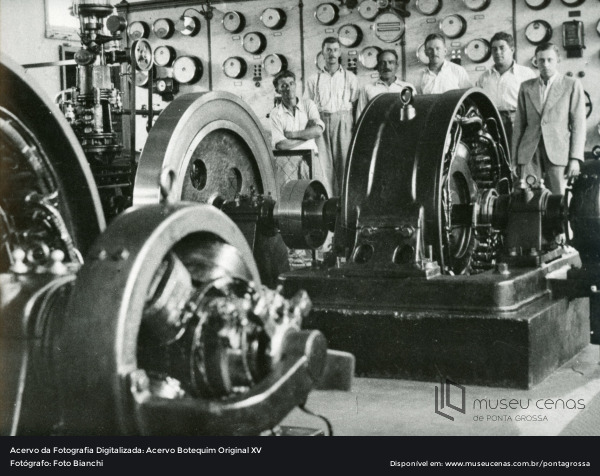 Fotografia do interior da Companhia Prada de Eletricidade, a primeira a estabelecer a energia elétrica na cidade, no início do século XX até a década de 1970. Trabalhadores não identificados. Registro da década de 1920.