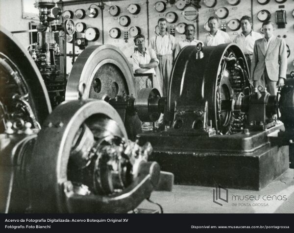 Fotografia do interior da Companhia Prada de Eletricidade, a primeira a estabelecer a energia elétrica na cidade, no início do século XX até a década de 1970. Trabalhadores não identificados. Foto da década de 1920.