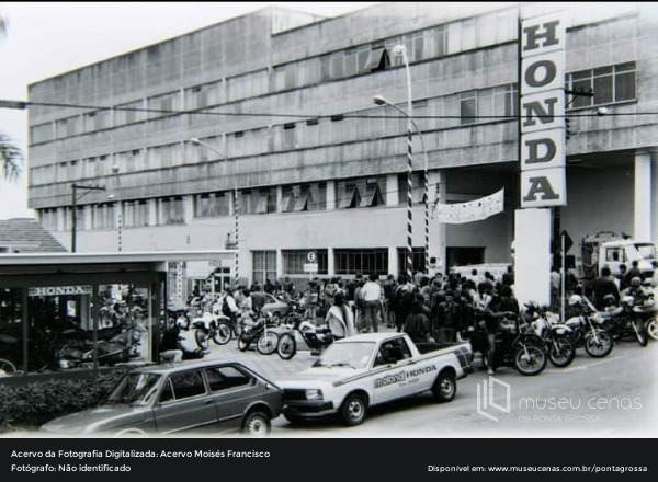 Fotografia da concessionária Honda, próximo ao atual edifício Guaíra, situado na Rua Balduíno Taques. Pessoas não identificadas.