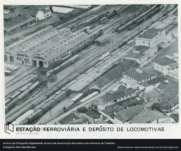 Imagem aérea da Estação Ferroviária de Ponta Grossa – PR, localizada no bairro de Uvaranas. Além de ser um complexo de ferrovias, também era utilizado como depósito de locomotivas. Registro de 1970.