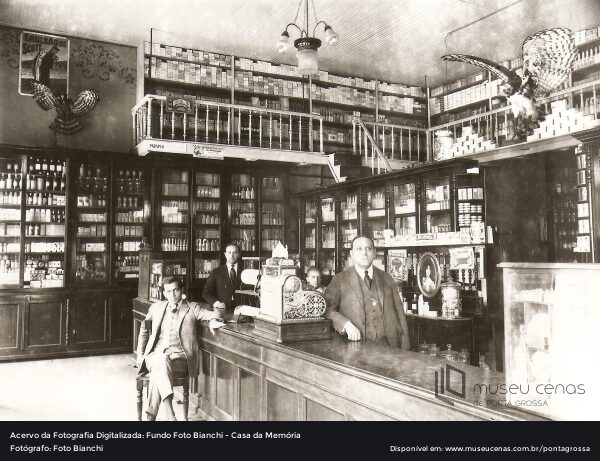 Interior da Farmácia e Drogaria Central. Na parte superior da fotografia pode-se perceber uma propaganda do “Biotônico Fontoura”. Homens não identificados. Fotoda da década de 1920.