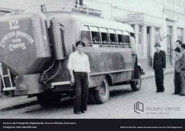Fotografia do ônibus expresso Princeza dos Campos que realizava viagens intermunicipais, antes da construção da rodoviária da cidade. Os passageiros embarcavam em frente a Praça Barão de Guaraúna, na Rua Doutor Joaquim de Paula Xavier.