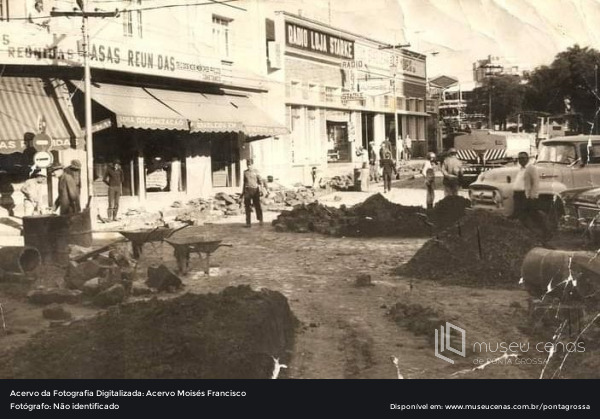 Asfaltamento das ruas em frente a Praça Barão do Rio Branco. Na imagem, é possível visualizar a loja Casas Reunidas e a Rádio Loja Starke, onde no local, funciona uma farmácia e uma loja de móveis e eletrodomésticos.