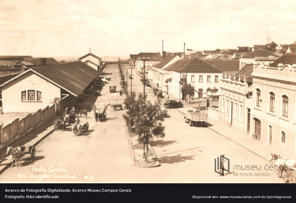 Registro da década de 1930. Vista Parcial da Rua Benjamin Constant. Na imagem, é possível observar a presença de carroças e automóveis, mostrando a chegada da modernização na cidade. Do lado esquerdo estão os barracões de carga, atuais Estação Paraná e Estação Arte.