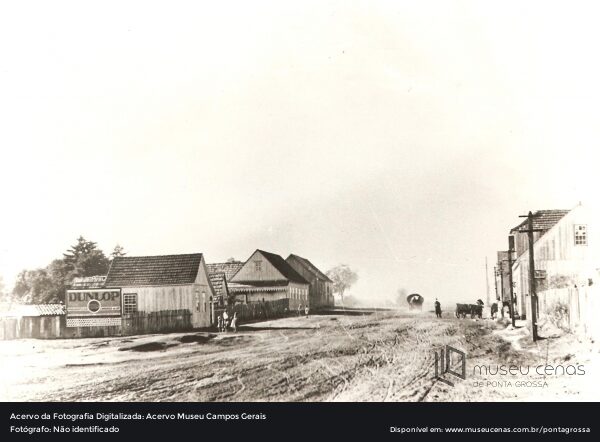 Fotografia da Rua Dom Pedro II, no bairro Nova Rússia, sem pavimentação. Nela, é possível observar a propaganda da loja Dunlop, de acessórios automotivos.
