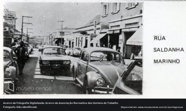 Fotografia da Rua Saldanha Marinho, uma das principais ruas do Centro de Ponta Grossa – PR. Pode-se observar a existência de várias casas comerciais e ao fundo, uma placa da loja Hermes Macedo.