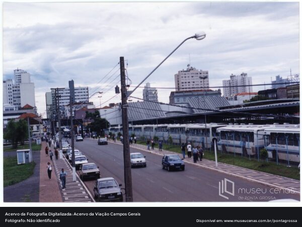 Vista parcial do terminal central. Na fotografia, é possível observar ônibus enfileirados próximos à calçada, bem como parte da Avenida Vicente Machado, com seus prédios e casas comerciais. Além disso, há pouco movimento no local.