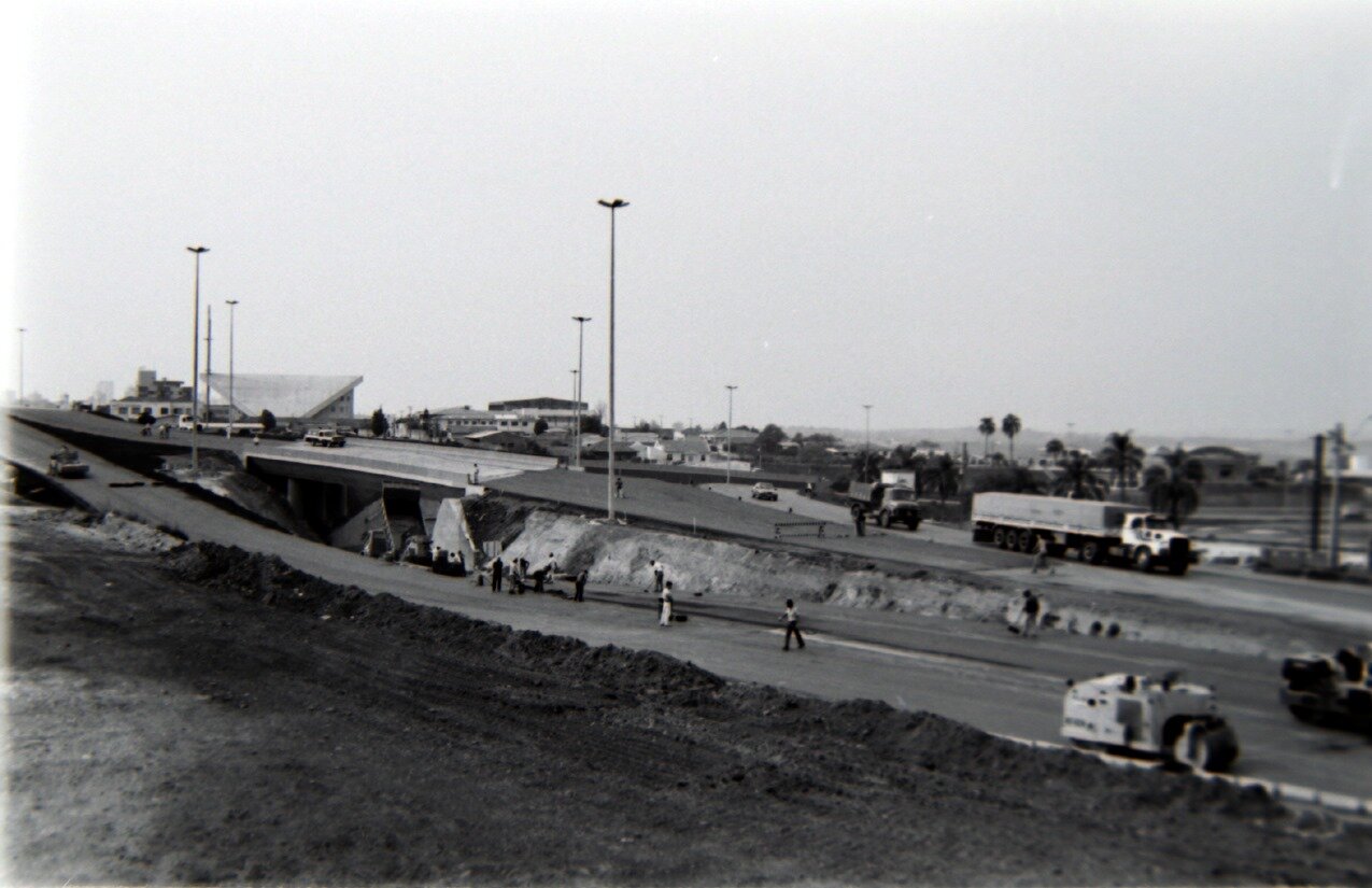 Do acervo de Foto Elite, o registro mostra o andamento das obras da construção do Trevo Eurico Batista Rosas, em algum momento da década de 1990. Ao fundo, é possível observar o telhado da Igreja São Sebastião.